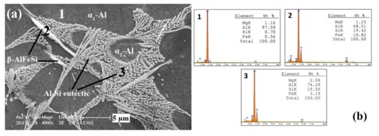 SEM image of sample 4.5 RGP at higher magnification in Figure 7a depicts the microstructure of the eutectic and the intermetallic particles. The Si particles have a flake shape and form a continuous network [55].