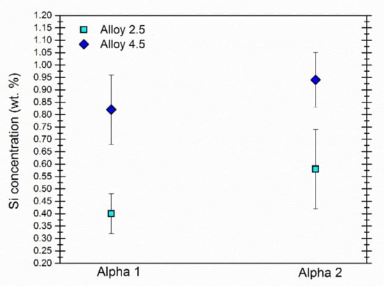 Figure 8 represents the concentration of silicon at the center of α1-Al and α2-Al grains in alloys 2.5 and 4.5. α2-Al particles, nucleated from the liquid portion of the slurry [57], have higher amounts of silicon, which leads to smaller potential differences between them and the silicon eutectic phase and/or iron-rich intermetallic particles, and results in less severe corrosion [34].