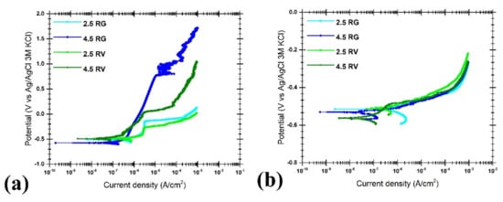 Potentiodynamic polarization curves of as-cast surface of the thin wall samples (2.5 RG, 2.5 RV, 4.5 RG, and 4.5 RV) in the diluted Harrison solution and in the solution of 3.5 g/L (NH4)2SO4 are reported in Figure 9.