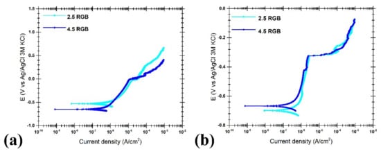 Considering the bulk microstructure, the results of potentiodynamic polarization test in the diluted Harrison solution and in the solution of 3.5 g/L (NH4)2SO4, of samples of 2.5 RGB and 4.5 RGB, are presented in Figure 10. In both of the solutions, the corrosion potentials of the two samples shows no significant difference.