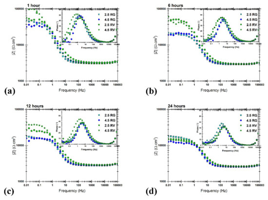 Bode plots of EIS spectra of samples 2.5 RG, 4.5 RG, 2.5 RV, and 4.5 RV after (a) 1 h; (b) 6 h; (c) 12 h; and (d) 24 h of immersion in the diluted Harrison solution.