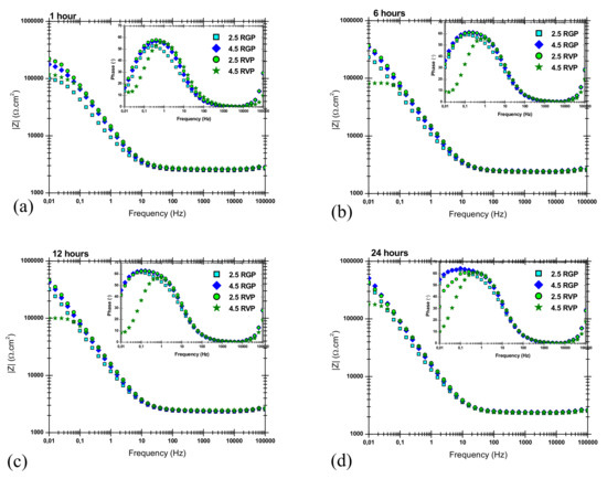 Bode plots of EIS spectra of samples 2.5 RGP, 4.5 RGP, 2.5 RVP, and 4.5 RVP after (a) 1 h; (b) 6 h; (c) 12 h and (d) 24 h of immersion in the diluted Harrison solution.
