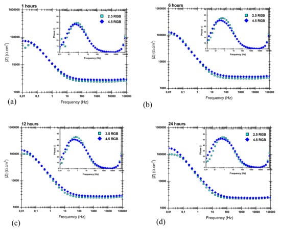 Bode plots of EIS spectra of samples 2.5 RGB, 4.5 RGB after (a) 1 h; (b) 6 h; (c) 12 h; and (d) 24 h of immersion in the diluted Harrison solution.