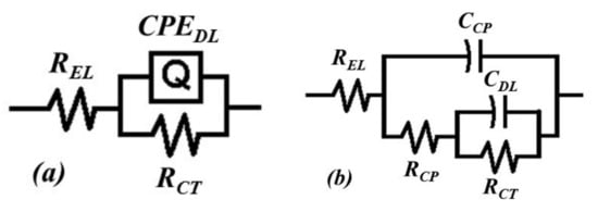 The equivalent circuits used to describe the electrochemical responses of the samples 2.5 RG(P/B), 4.5 RG(P/B), 2.5 RVP, and 4.5 RVP are shown in Figure 15.