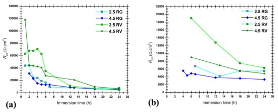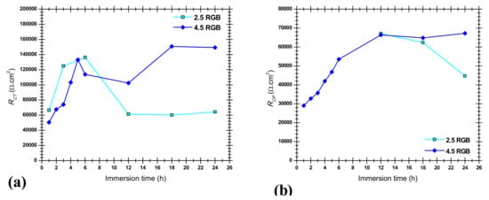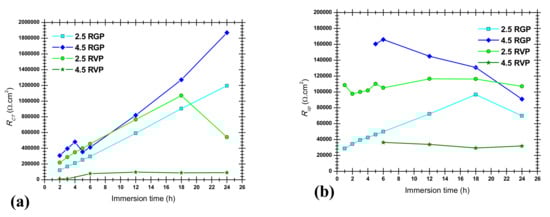 In the case of ground thick plate (bulk) samples, reported in Figure 18, the behavior of 2.5 RGB and 4.5 RGB samples are very similar. After some initial fluctuation, values of RCT remain almost constant for the two samples from 12 to 24 h of immersion, but never reach the high resistance showed by the ground thin wall samples. RCP values increase from the first hour of immersion for sample 4.5 RGB.