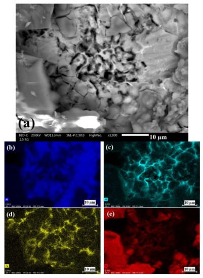 (a) SEM micrograph and elemental map analysis of corroded surface of sample 2.5 RG; (b) Al; (c) Si; (d) Fe; and (e) O.