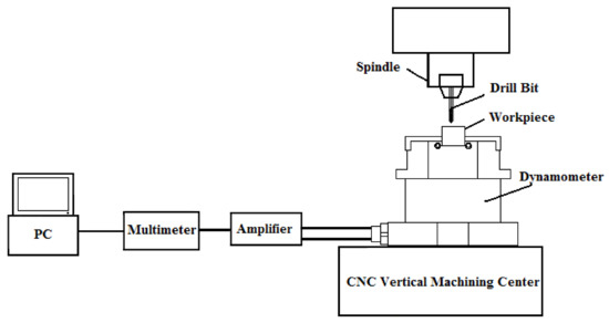The drilling experiments were performed on a Johnford VMC-550 (Johnford machinery industries CO., LTD, Taiwan) vertical machining center (maximum rotation speed of 6000 rev/min and 7.5 kW power). The developed thrust force was recorded by using the data acquisition system. A piezo-electric dynamometer (Kistler model 9272-A; Kistler Instrument AG, Winterthur, Switzerland) was used to measure the thrust forces. The dynamometer was connected to the Kistler 5070-Amulti-channel charge amplifier (Kistler Instrument AG, Winterthur, Switzerland). First, the signals were recorded and sent from the dynamometer to the data reading card (Kistler PCIM DAS 1602/16) then to the Kistler 5070-A multi-channel amplifier and, finally, the recorded signals were stored and processed with Kistler Dynoware 2825D-02 software (version 2.6.5.16, Kistler Instrument AG, Winterthur, Switzerland). The mean thrust force values were measured at the full engagement phase of the drill bit and the MMC material interface, as presented in Figure 1. The schematic of the experiment setup for the measuring of the thrust force is shown in Figure 2.