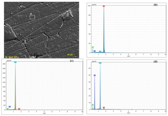 (a) SEM image of Mg/10 wt %SiC/0.25 wt %GNPs hybrid MMC; (b) EDS peaks for area No. 1; (c) EDS peaks for area No. 2; and (d) EDS peaks for area No. 3.