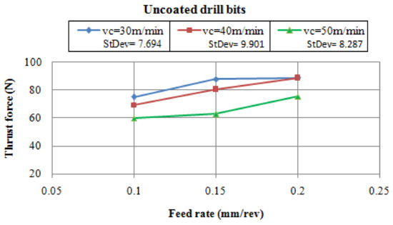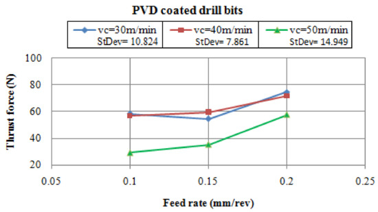 - The thrust force is increased by increasing the feed rate, while the thrust force decreases with the increase of the cutting speed. The highest thrust forces were reached at lower cutting speed when using uncoated drill bits. However, with the PVD-coated drill bits, the lowest thrust force was reached at the cutting speed of 50 m/min with the three levels of feed rates.