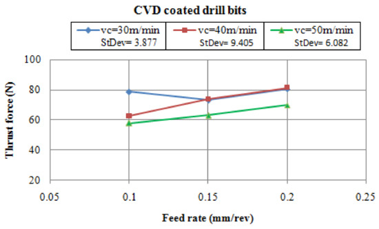 Thrust force variation with feed rates at different cutting speeds when using CVD-coated drill bits.