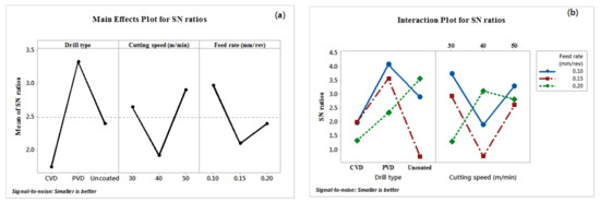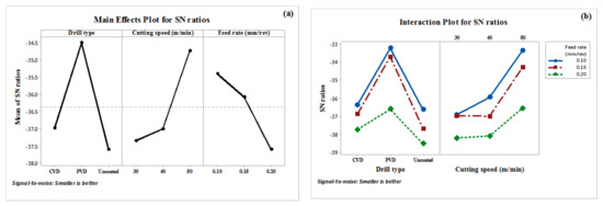 Figure 8a shows the plot of S/N ratio of the thrust force for Mg/10 wt %SiC/0.25 wt %GNPs hybrid MMC. The figure shows that the optimal parameter combination to reach the minimum value of the thrust force were the PVD-coated drill bit, a cutting speed of 50 m/min, and a feed rate of 0.10 mm/rev. Figure 8b presents the interaction plot generated by Minitab software showing the interactions between the parameters (cutting speed, feed rate, and type of drill bit). Minitab software forms the interaction plot through plotting the characteristic average of two parameters for each combination of parameter levels.