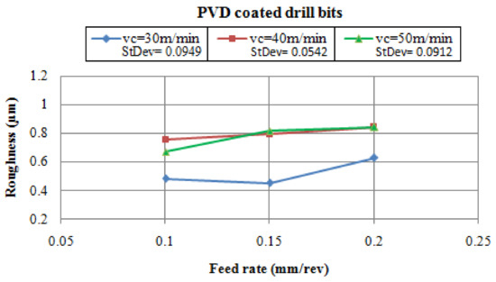 Surface roughness with feed rates at different cutting speeds when using PVD-coated drill bits.