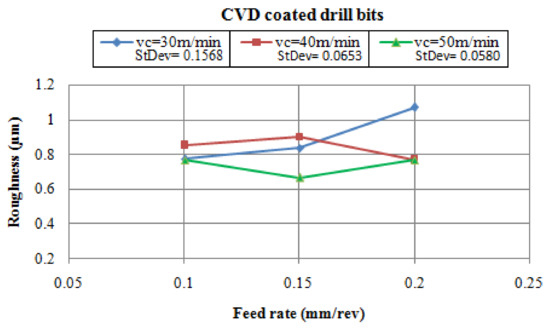 Surface roughness with feed rates at different cutting speeds when using CVD-coated drill bits.