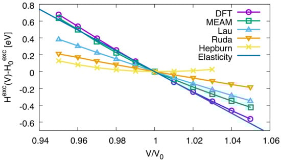 Inserting the material parameters given above gives the prediction , which is in perfect agreement with the DFT value (identical to the given accuracy, see Table 3 in []), and deviates from the empirical potentials, as expected. The continuum result for the strain dependence of the solution enthalpy is depicted in Figure 1. Only for large strains, where linear theory of elasticity is no longer applicable [], deviations occur with the DFT results.
