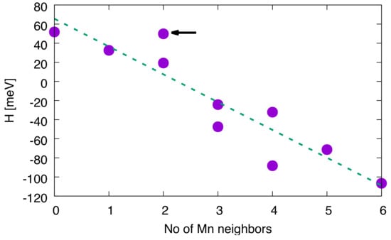 Hydrogen solution enthalpy as function of the number of Mn neighbors. For some cases, there are different energy values, which are due to different atomic arrangements, e.g., trans or cis configurations (see [] for a detailed discussion). The dashed curve is a linear fit. The black arrow points to the trans configuration with two neighboring Mn atoms at opposite ends of the octahedron surrounding the H atom. This configuration is the reference for the Fe-Mn-Al-H system.