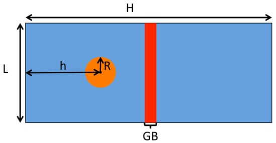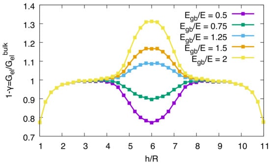 A spherical precipitate is placed at a certain distance from either a free surface or a grain boundary. If the precipitate is neither close to the free surface nor to the grain boundary, the elastic energy reaches the bulk value, which can be calculated analytically under the given conditions (see [] for details). For different distances of the precipitate to a free surface or the grain boundary and different elastic properties of the grain boundary, the elastic energy of the system is calculated with the finite element method. Close to the free surface, the elastic energy drops with the distance of the precipitate’s center of mass to the surface h (see Figure 4).