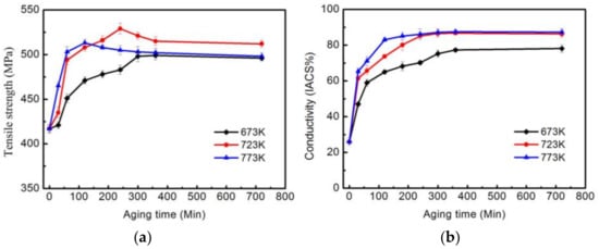 Figure 1 shows the influence of the aging time on both the tensile strength (Figure 1a) and electrical conductivity (Figure 1b) of the studied alloy. It can be observed that tensile strength and electrical conductivity increase rapidly during the early stage of aging as the second phase particles rapidly form in the matrix. It can also be seen that the time required to reach peak strength decreases with the increasing aging temperature (Figure 1a). On the other hand, it can also be observed that, when the aging temperature is increased to 773 K, the tensile strength in the peak aged condition is lower than that of aging at 723 K. As shown in Figure 1b, the electrical conductivity can reach to above 80% IACS, when aged at 723 K or 773 K. An excellent combination of those properties, such as a tensile strength of 536 MPa and an electrical conductivity of 85.3% IACS, is obtained in the Cu-Cr-Zr alloy aged at 723 K for 240 min (minimum). The most suitable aging condition is considered to be one where good combinations of strength and conductivity can be obtained after aging. As a result, the optimized aging treatment for this alloy is 723 K for 240 min.