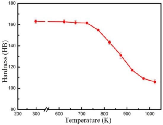 Figure 2 shows the hardness of the peak aged samples after annealing at different temperatures for 60 min. The hardness in the peak aged condition is 163 HB. When the annealing temperature is lower than 773 K, the hardness of the alloy can be kept at a high value. The hardness of the alloy begins to decrease rapidly when the annealing temperature is above 773 K. After annealing at 823 K, the decrease in hardness is significant, and the hardness is 143 HB, about 87.4% of the unannealed sample. The hardness of the alloy continues to decrease as the temperature increases. When the annealing temperature increases to 873 K, the hardness is 131 HB, just about 80.4% of the unannealed sample.