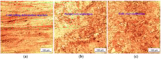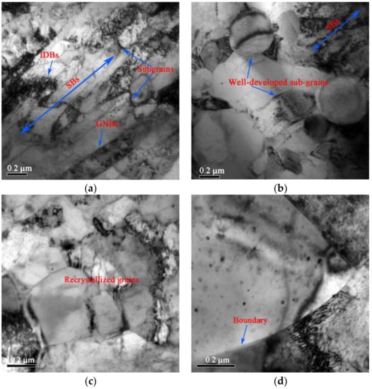 Shear zones which have a certain angle with respect to the roll direction are formed after the Cu-Cr-Zr alloy is severely deformed via cold rolling. The shear deformation zones have a higher dislocation density than other regions, and the nucleation and growth of recrystallization occur more easily in the shear deformation region, as shown in Figure 3 and Figure 4. The annealing temperature is a critical external factor for recrystallization, and the difference in the microstructure of different regions is a critical internal factor for inducing a difference in recrystallization behavior. Because of the lower deformation energy in the uniform deformation zones, more energy is required for the nucleation of recrystallization and, as a result, a higher temperature is needed for recrystallization. Unlike uniform deformation zones, higher dislocation densities and deformation are present in the shear deformation zone due to the severe shear deformation. Dislocation cell structures in the shear deformation zone rapidly form the new sub-grains during annealing, and recrystallization first occurs in the shear deformation zones, as shown in Figure 3c.