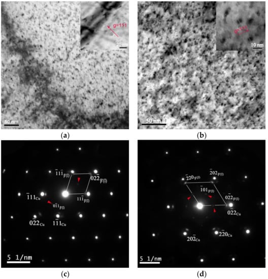 BF micrographs of Cu-Cr-Zr alloys with 60-min-annealed states at different temperatures: (a,b) 823 K and (c,d) 873 K.