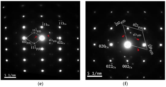 Figure 5 shows the BF and corresponding SAED patterns of the precipitates formed during aging. When aged at 723 K for 30 min, very fine precipitates are observed with a weak contrast. According to high-magnification near-double beam observation, the precipitated phase entails spherical particles with a size of about 2 nm, and there is a double leaf petal-like contrast, which suggests that the precipitate phase is coherent with the matrix, as shown in Figure 5a. Figure 5b shows the structure of the alloy after aging at 723 K for 240 min. A large number of precipitates are observed, significantly enhancing the contrast. The size of the precipitates is slightly larger, about 4 nm. A non-contrast line perpendicular to the manipulated vector is also observed, indicating that there is a coherent relationship between the precipitated particles and the matrix. From the SAED of the sample aged for 30 min, a few superlattice spots can be observed in Figure 4c,d (marked by a triangle arrow). This is probably due to the enrichment of solute atoms on alternate {011} planes []. Therefore, the precipitate is likely to have an ordered lattice structure. Diffraction spots from the precipitated particles are shown in Figure 4c,d, which indicates that the discontinuous precipitates are fcc Cr-rich phases with a cube-on-cube OR (designated as β′(I)). The result is also in accordance with previous studies on Cu-Cr-Zr alloys [,,,]. The precipitate lattice parameter is calculated to be about 0.4180 nm. Figure 5e,f show the corresponding SAED of the sample aged for 240 min (peak aged). Superlattice reflections are also observed and the results indicate that the produced precipitates here are also ordered (marked by a triangle arrow). The SAED shows that these precipitates also have an fcc structure with a lattice constant of 0.4150 nm (designated as β′(II)). The orientation relationship exhibited here is determined to be: [211]Cu//[011]β′(II), {-111}Cu//{200}β′(II) and [100]Cu//[111]β′(II), {02-2}Cu//{02-2}β′(II). The above results show that β′(II) has a lattice constant close to as well as an ordered structure with β′(I). As a result, it can be concluded that β′(II) and β′(I) are the same crystal structure with different orientation relationships to the matrix. The same precipitates formed during the aging process show a variety of interphase relationships confirmed in Cu-Ni-Si [], Mg-Zn-Al [], and Al-Mg-Si [] alloys. Although the fcc precipitates have been reported, the existence of two orientation relationships for the transition phase β′ is proposed and confirmed in this work for the first time, for Cu-Cr-Zr alloy after a cold-solution deformation-aging treatment.
