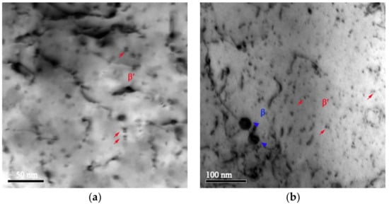 The fundamental reason for the electrical resistivity of a metal is that the lattice produces the scattering of electrons. The total resistivity of copper alloys is mainly caused by the intrinsic resistivity pure copper, solid solute atoms, and precipitated crystal defects (grain boundaries, dislocations, etc.) according to the theory of conductivity. Different types of crystal defects have different effects on the resistivity, from large to small, followed by solid solute atoms, phase precipitates, vacancies, dislocations, and other defects. After the aging treatment, a large number of solute atoms precipitate from the supersaturated solid solution, resulting in a significant decrease in the electron scattering effect. The size of the β′ phases are in the range of 2–5 nm, whereas the mean free path of electrons of pure copper is about 42 nm; the effect of precipitation on the conductivity of the alloy is therefore very small. In addition, a large number of tangled dislocations in the cold deformation state evolve into dislocation cells, sub-grains, and other sub-structures during the aging process, resulting in a significant reduction in the dislocation density of the dislocation cells and sub-grains (Figure 4b). As a result, one can conclude that the aging treatment can greatly increase the conductivity of the cold-worked Cur-Cr-Zr alloy, as shown in Figure 1b.