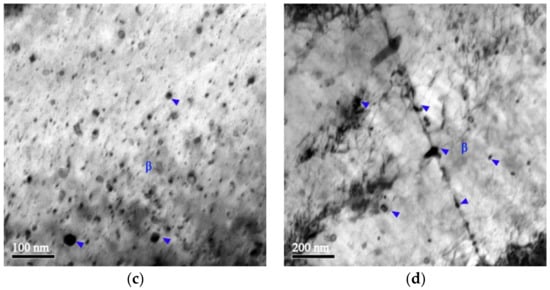 Figure 6 shows the BF micrographs of the precipitates of the peak aged samples after annealing at different temperatures. As shown in Figure 6a, a large number of β′ precipitates still exist in the alloy. The β′ precipitates at the sub-grain boundary still exhibit a double petal-like contrast, indicating coherence with the matrix. The β phase, having a larger size, can be clearly observed in the grain boundary, as shown in Figure 6b. This indicates that during the formation of the crystal boundary, the transition phase β′ gradually loses coherence and grows into a larger equilibrium phase β. When the annealing temperature further increases to 873 K, the precipitates all evolve to coarse β particles, as shown in Figure 6c. The size of the precipitates significantly increases, and precipitation-free zones form at the grain boundaries, as shown in Figure 6d.