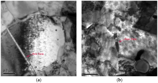 Figure 7 shows the micrographs of twins of the peak aged samples annealed at different temperatures. The growth of the recrystallized grains is accompanied by the formation of annealing twins. Figure 7a,b show the BF images of annealing twins annealed at 873 K. The twins formed inside the grains have two parallel twin boundaries which traverse the whole grain. The width of the twins is about 30 nm and only a few dislocations are observed inside the twins, as shown in Figure 7a. Besides the parallel twins, annealing twins are also formed at the grain boundaries of the recrystallized grains, as shown in Figure 7b. A high dislocation density is observed in these twins, whereas only a few dislocations were observed around these twins. When the annealing temperature increases to 973 K, the twins grow significantly and the width can increase up to 200 nm, as shown in Figure 7c. Some of the twins can grow in an intergranular way, and their growth is hindered when they meet coarse precipitates, as shown in Figure 7d. The growth of the twins not only forms parallel twins, but some stepped structures are also observed, as shown in Figure 7e. The SAED result in Figure 7c shows that the pattern belongs to typical twins in fcc metals []. The twin plane is {111} and the direction is <112>, respectively. The zone axis between the matrix and the twin has a rotational symmetry of 180° and can be considered as [101]M//[-10-1]T (M-Matrix, T-Twin), as shown in Figure 7f.