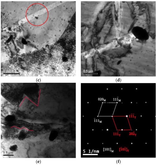 The BF and SAED of the twins of the studied alloy under different annealing temperatures: (a,b) 873 K and (c–e) 973 K; (f) the SAED of twins for the circular selection region in (c).