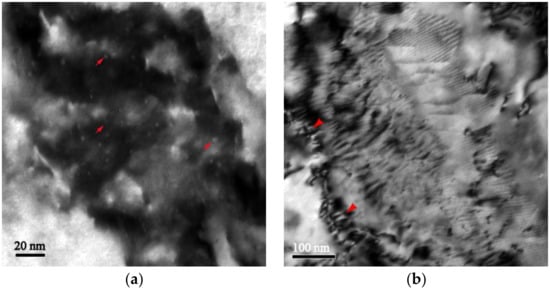 The strength of the Cu-Cr-Zr alloy approaches its peak and the conductivity reaches a high and stable value after aging at 723 K for 240 min. A significant improvement in the strength of the Cu-Cr-Zr alloy is obtained after the aging treatment due to the precipitation, which drains the dissolved solute atoms from the copper matrix by forming nano-scale precipitates. After aging at 723 K for 240 min, the alloy is still in the recovery stage, and recrystallization does not occur. A large number of nano-sized coherent β′ phases nucleate in the dislocation zone (Figure 8a) through the interaction with the dislocations, producing a good strengthening effect and simultaneously pinning the dislocations and dislocation cells (Figure 8b); this finally results in the enhancement of the alloy’s recrystallization resistance capability. Zhang et al. [] reported that the energy of the precipitate/matrix interface was increased by Zr in the ternary Cu-Cr-Zr alloy and composite, making it more difficult for dislocations to cut the coherent precipitates. Holzwarth et al. [] found that the experimental data agrees much better with the assumption of an Orowan mechanism than with the shearing strengthening model, especially in the peak-hardened and slightly over-aged state of the Cu-Cr-Zr alloy. Consequently, the enhancement effect of the dispersed nanoparticles can be expressed by the following Orowan-Ashby equation in Equation (1) []: