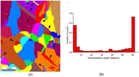 The growth of the recrystallized grains is accompanied by the formation and growth of annealing twins (marked by a triangle arrow in Figure 7a). It is shown that the growth of the recrystallized grains is restricted by the adjacent grains (Figure 7a). To release the internal deformation energy, twins with parallel interfaces form via the shear mode in order to lower the driving force for recrystallized grains to grow, as shown in Figure 7a. When multiple grains come together, dislocation storage zones are produced by the twins in the intersection of the grain boundary in order to lower the driving force for interface migration and hinder grain combination and growth, as shown in Figure 7b. Thus, the formation of twins can inhibit recrystallization, therefore enhancing the recrystallization resistance of the alloy. Theoretically, without the pinning of the secondary particles, the growth of twins can be infinite in the longitudinal direction. The secondary particles can block the growth of the twins and eventually hinder the recrystallized grains from growing. Due to the formation of twins, as shown in Figure 9a, the recrystallized grain size is uniform and the misorientation of the grains is about 60°, as shown in Figure 9b. This structure is a relatively stable state and reduces the hardness lost after full recrystallization.