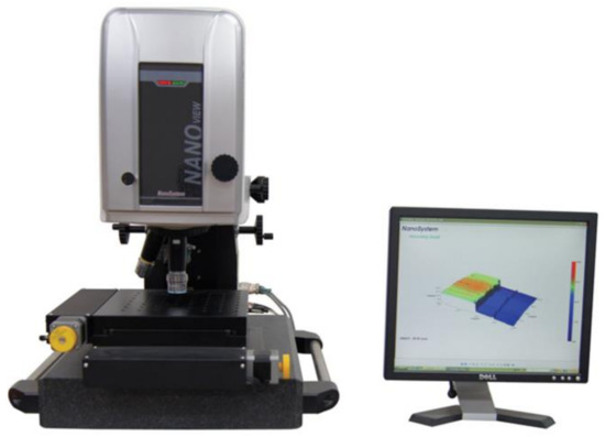 The multiscale rough metallic surfaces were directly mounted on a stage of non-contact three-dimensional (3D) surface profiler (NanoView-E1000; NanoSystem, Daejeon, Korea) shown in Figure 2 to acquire the average roughness and morphologic images. Images of 600 µm × 500 µm area were acquired accordingly.