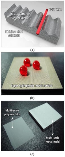 In this study, a simple and large-scale patterning method was realized by direct patterning on the metal surface using wire electrical discharge machining (WEDM), a metal processing method, in order to produce the micro/nanostructure in one-step fabrication. WEDM is widely used in the metal processing field and is a precise processing technique that can create shapes on surfaces in numerous micro-units [9,10,11,12,13,14]. Moreover, since the WEDM process induces discharge on the metal surface during processing, the nano-sized roughness is automatically created, and the multi-scale shape can be obtained in one step. If the surface has this multi-scale structure, superhydrophobic surfaces could be obtained comparatively easily due to the lotus effect, where the leaves of the lotus flower exhibit hydrophobicity [15,16,17].