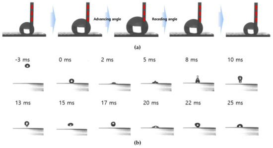 (a) Hysteresis and (b) time-lapsed images of water droplet shown in a superhydrophobic metal mold.