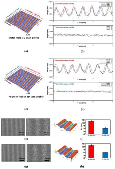 Figure 5b show the line scan profile of the metal mold. Figure 5b shows the scanned data of the cross-section of the metal mold, whereby the film is divided into the X-axis and Y-axis (in millimeters). The top waveforms (X direction) in Figure 5b represent 500 micrometer cycles. Figure 5d shows the line scan profile of the replicated polymer film. Figure 5d shows the scanned data of the cross-section in the replicated polymer film, whereby the film is divided into the X-axis and Y-axis (in millimeters). The top waveforms (X direction) in Figure 5b represent 500 micrometer cycles. As shown in Figure 5b,d, the line scan profiles are almost identical. In the X direction scan profile shown in Figure 5b,d, the micro-sized structures repeated at 500 micrometers are similar. Also, streamlined shapes with ripples can be seen due to the nano-sized roughness. In the Y direction scan profile of Figure 5b,d, the nano-sized roughnesses of the metal mold and polymer replica surfaces almost coincide. This indicates that the transfer of the morphology from the metal mold to the polymer film is accomplished by UV-assisted capillary force lithography.
