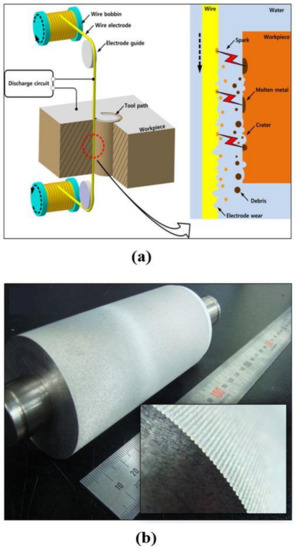 (a) Schematic diagram of WEDM process used to fabricate multi-scale patterned roll; (b) Optical images of the fabricated multi-scale patterned roll for roll-to roll process.