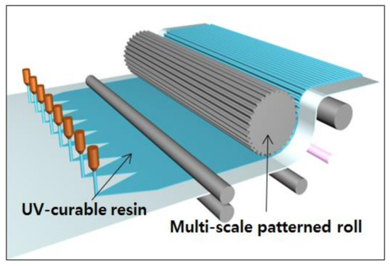 Figure 7 shows a schematic illustration of the roll-to-roll process using a multi-scale patterned seamless mold in which a nanoimprint lithography technique using UV-curable resin was used for the pattern replication.