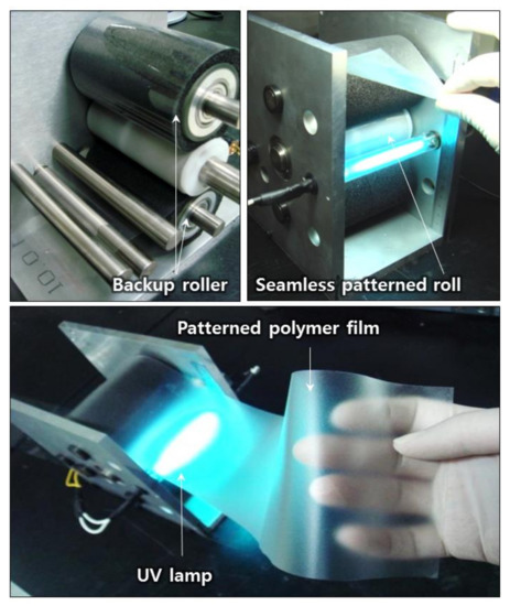 Finally, roll-to-roll nanoimprint patterning was carried out using local equipment, as shown in Figure 8. In the roll-to-roll printing, a polyethylene terephthalate (PET) substrate coated with UV-curable resin was placed in the equipment. The lower back-up transfer roller was rotated at 1 rpm, and the PET film was exposed to UV light (l = 250–400 nm, dose = 300 mJ/cm2). After the PET substrate was run through the patterned roll mold, the dual-roughness pattern was replicated onto the cured PFPE resin on the PET support within a few seconds [26,32,33].