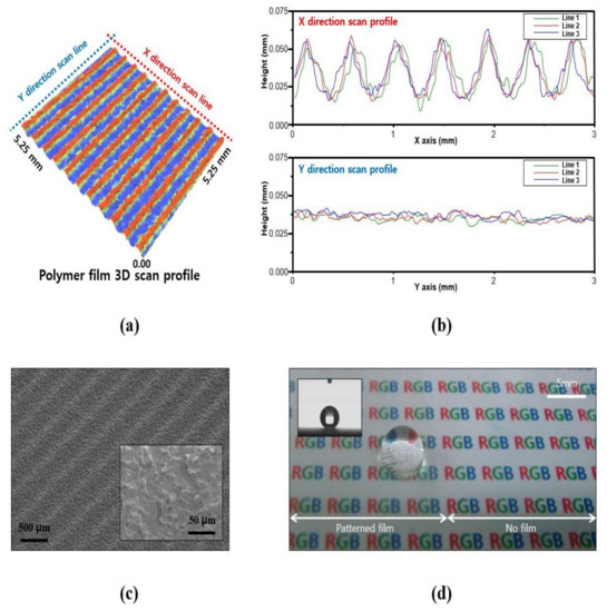 Figure 9 shows the replicated surface morphology of the polymer film formed on the metallic roll mold surface. Figure 9a shows 3D images (5.25 mm × 5.25 mm) of the partially replicated polymer film after the roll-to-roll process, providing a direct understanding of the 3D shape of the surface. Figure 9b shows a line scan profile of the replicated polymer film after the roll-to-roll process. Figure 9b shows the scanned data of the cross-section in the replicated polymer film in which the film is divided into the X-axis and Y-axis (millimeters). The top waveforms (X direction) in Figure 9b represent 500 micrometer cycles. Figure 9c shows a SEM image of the polymeric replica with the inset showing a nano-sized surface roughness. It can be confirmed that the morphology of the metal mold was successfully transferred to a replicated polymer film using a roll-to-roll method, since Figure 9a–c are similar to Figure 5a,b,e, respectively. Figure 9d shows the transmittance property of the replicated polymer film with the inset showing water droplets on the replicated polymer film.