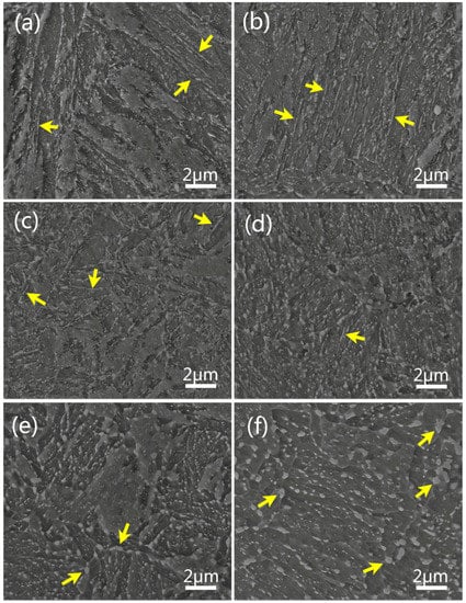 SEM microstructures of 42CrMo4-V steel tempered at: (a) 570 °C; (b) 600 °C; (c) 630 °C; (d) 660 °C; (e) 690 °C; (f) 720 °C.