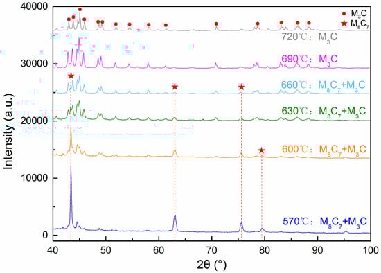 XRD tests are used to determine the type of carbide precipitates with different tempering temperatures. The results are shown in Figure 3. After being tempered at 570 °C, there are mainly V-rich M8C7 carbides and Fe-rich M3C type carbides. With the increase in tempering temperature, the diffraction peak intensity of M8C7 is getting lower and lower, which means that the relative content of M8C7 type carbide is decreasing. When the tempering temperature is over 690 °C, the M8C7 type carbides almost disappear. Thus, the carbide precipitation sequence is M8C7 → M3C.