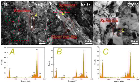 Further observations on the morphologies and compositions of carbides of 42CrMo4-V steel tempered at various temperatures are shown in Figure 4. Combined with XRD results and EDX results, it can be found that after being tempered at 570 °C (Figure 4a) the long strip-like carbides are M3C and most of them are between 300 nm and 600 nm. After being tempered at 630 °C (Figure 4b), the short rod-like carbides are M3C and the spherical carbides are M8C7. The length of M3C are 150–300 nm and the diameter of M8C7 are less than 100 nm. When the temperature increased to 720 °C (Figure 4c), the irregular spherical carbides are M3C with a diameter of 150–200 nm.