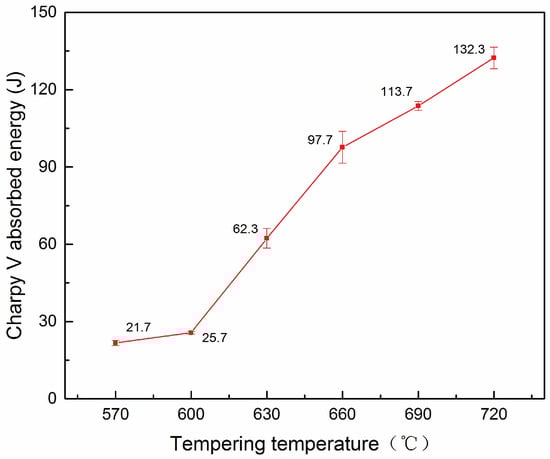 It can be seen that the low temperature toughness increases significantly with the increase of tempering temperature. A major factor for the increase is the softening of matrix. During the fracture process, the propagation of a crack depends on the stress concentration at the crack tip. When the stress concentration is high enough to exceed the yield strength of the metal, plastic deformation occurs and there is a plastic deformation region around the crack tip. Furthermore, the softer the base metal, the larger the plastic deformation region. Additionally, large plastic deformation district will result in slower crack propagation and larger absorbed energy [].