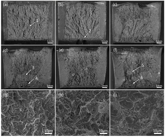 Macro fractographs of 42CrMo4-V steel tempered at (a) 570 °C; (b) 600 °C; (c) 630 °C; (d) 660 °C; (e) 690 °C; (f) 720 °C; (g–i) are high-magnification images of zone 1, 3 and 5 in (a–f), respectively, (j–k) are high-magnification images of zone 2, 4 and 6 in (a–f), respectively.