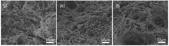 Figure 5 shows the absorbed energy of 42CrMo4-V steel tempered at different temperatures. The absorbed energies of 42CrMo4-V steel were found to increase significantly from 21.7 J to 132.3 J with increasing tempering temperatures from 570 °C to 720 °C. The fracture surfaces of impact specimens are shown in Figure 6. Only the samples with representative result are displayed. The macro fractographs are shown in Figure 6a–f. After the 570 °C temper (Figure 6a), the radial region, which is known as the crack unstable propagation region as well as the crack rapid propagation region, takes up most of the fracture surface and the shear lip is thin, indicating that the failure mode is a brittle fracture. The thickness of shear lip increases and the area of radial region reduces with increasing tempering temperatures from 600 °C (Figure 6b) to 720 °C (Figure 6f), indicating that the mode of fracture evolves from brittle to ductile as the tempering temperature rise []. Figure 6g–i is high-magnification images of zone 1, 3 and 5 in Figure 6a–f, respectively. With increasing tempering temperature, the dimple fractures in radial region increase, indicating that the failure mode of radial region transforms from cleavage fractures to quasi-cleavage fractures, a failure mode between brittle fracture and ductile fracture. Figure 6j–l is high-magnification images of zone 2, 4 and 6 in Figure 6a–f, respectively. It can be found that dimples in fibrous zones become larger and deeper with increasing tempering temperature. A large number of microscopic voids form and grow inside the metal under the external force. The sample fractures when the voids connect to each other. The void remained in the fracture surfaces is the dimple. The large size of dimple means that the material has a large plastic deformation before the fracture, so samples with large dimples have a preferable impact toughness [,]. With increasing tempering temperature from 570 °C to 720 °C, the proportion of dimple fractures increase and the dimples become larger and deeper, resulting in the increase of absorbed energy [].