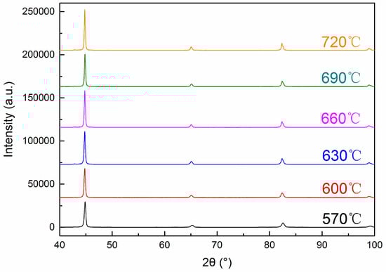 XRD spectra of 42CrMo4-V steel tempered at 570–720 °C.