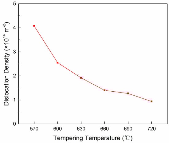 Dislocation density of 42CrMo4-V steel tempered at 570–720 °C.