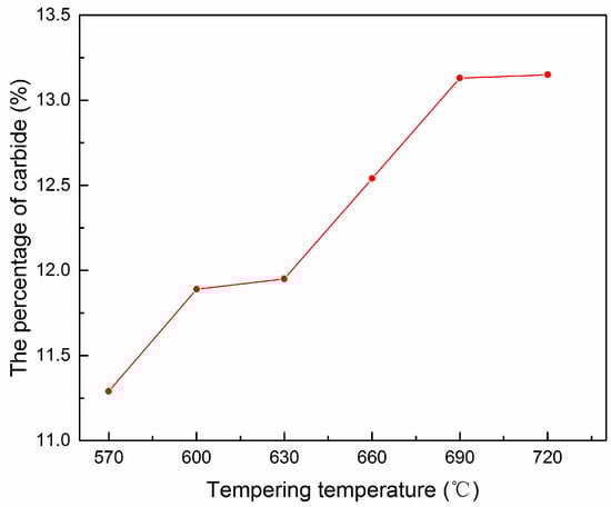 The decrease of solid solution strengthening is mainly due to the precipitation of carbide, which leads to the decrease of the degree of supersaturation of the matrix []. Figure 9 shows the relationship between the percentage of carbides and the tempering temperature. It demonstrates that the percentage of carbides increases with the increase in tempering temperature. The more precipitates mean the more interstitial atoms, especially C atoms, dissolve in the matrix precipitated from the supersaturation solid solution, resulting in the decrease of the degree of supersaturation. In 42CrMo4-V steel, with increasing tempering temperature from 570 °C to 720 °C, the matrix metal becomes softer, the plastic deformation region around the crack tip becomes larger, resulting in a preferable low temperature impact toughness.