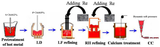 The steelmaking process of high-strength structural steel with 420 MPa yield strength is shown in Figure 1. Through the RE treatment combined with heat treatment and controlled rolling, it was possible to control the cooling stability, which could limit the yield ratio to less than 0.85. Moreover, the toughness and welding performance of the final product could be enhanced.