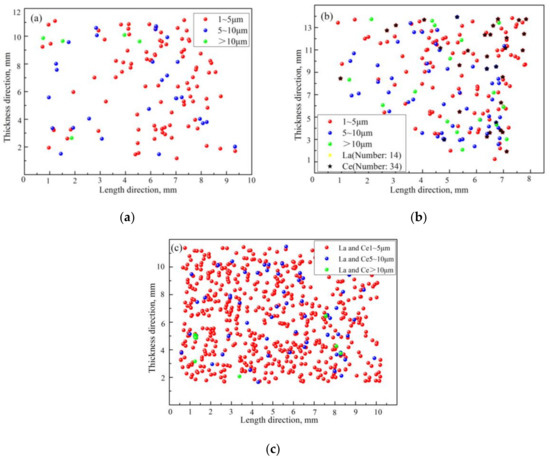 Size distribution of inclusions in structural steel. ((a) inclusions in regular structural steel without RE; (b) inclusions in structural steel from LF refining with RE addition; (c) inclusions in structural steel from RH refining with RE addition).